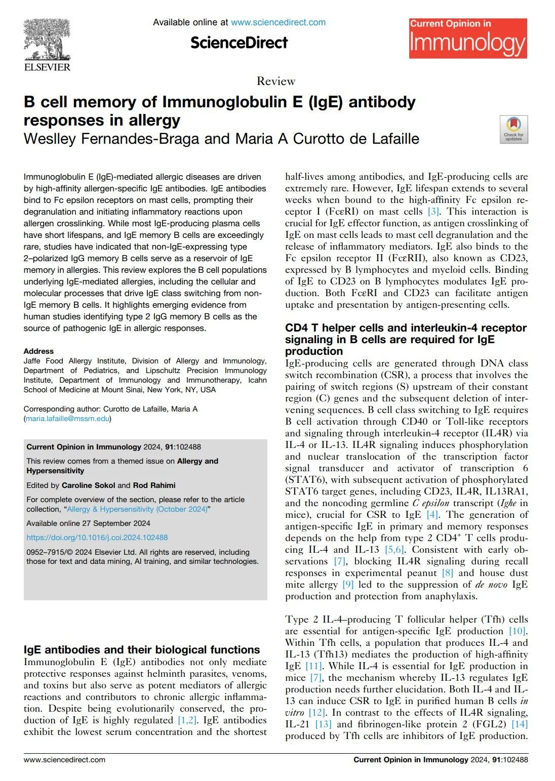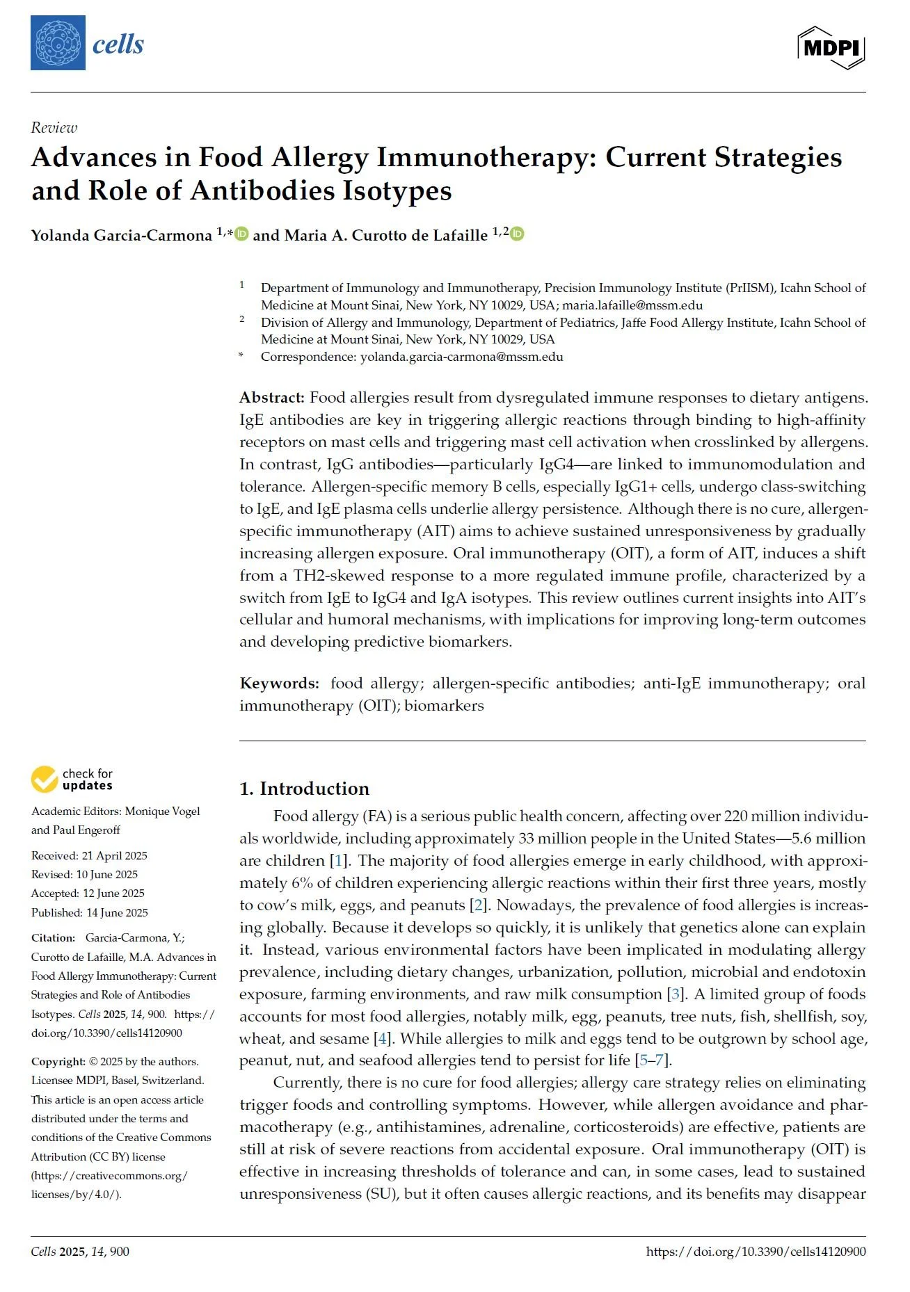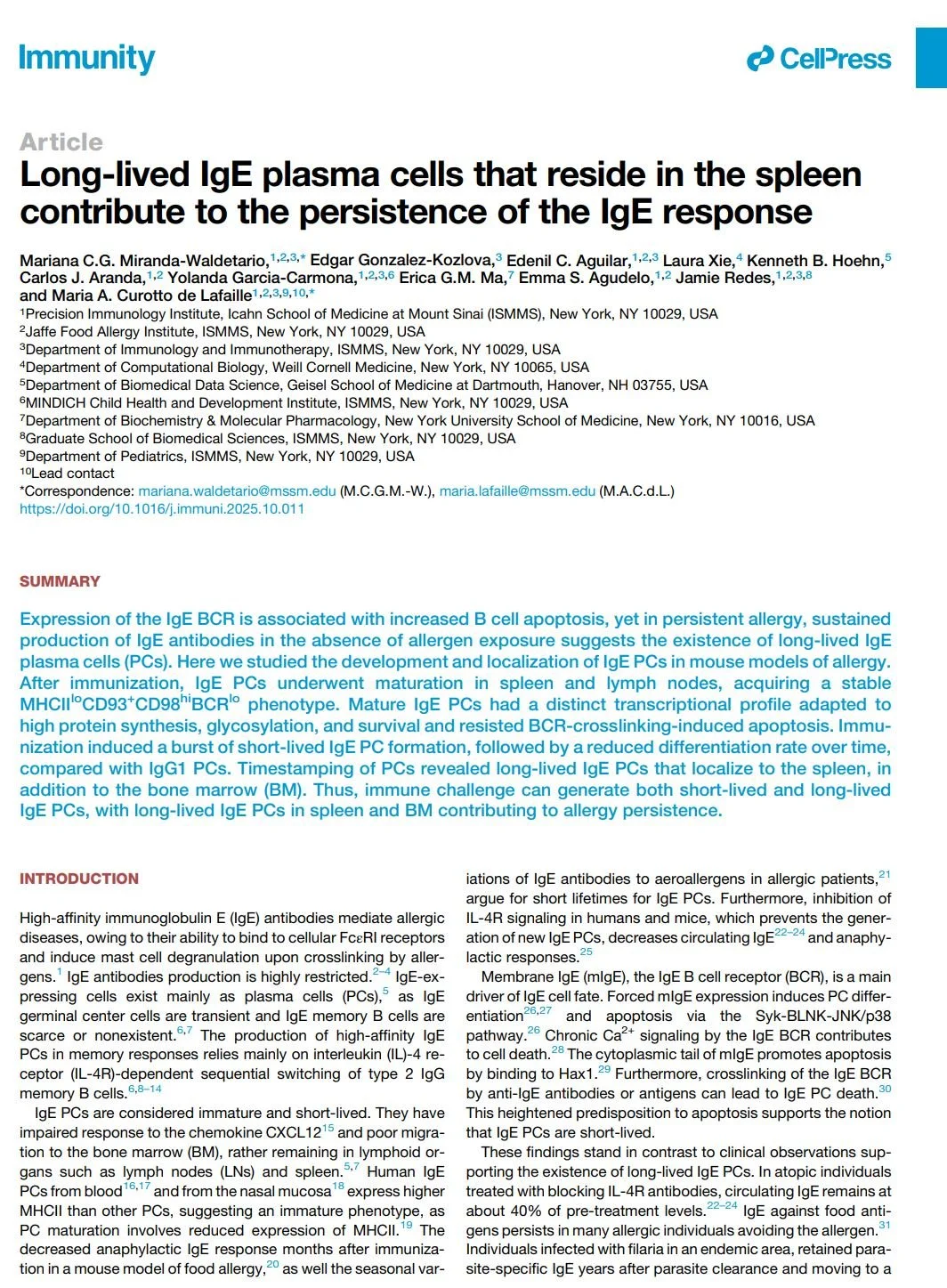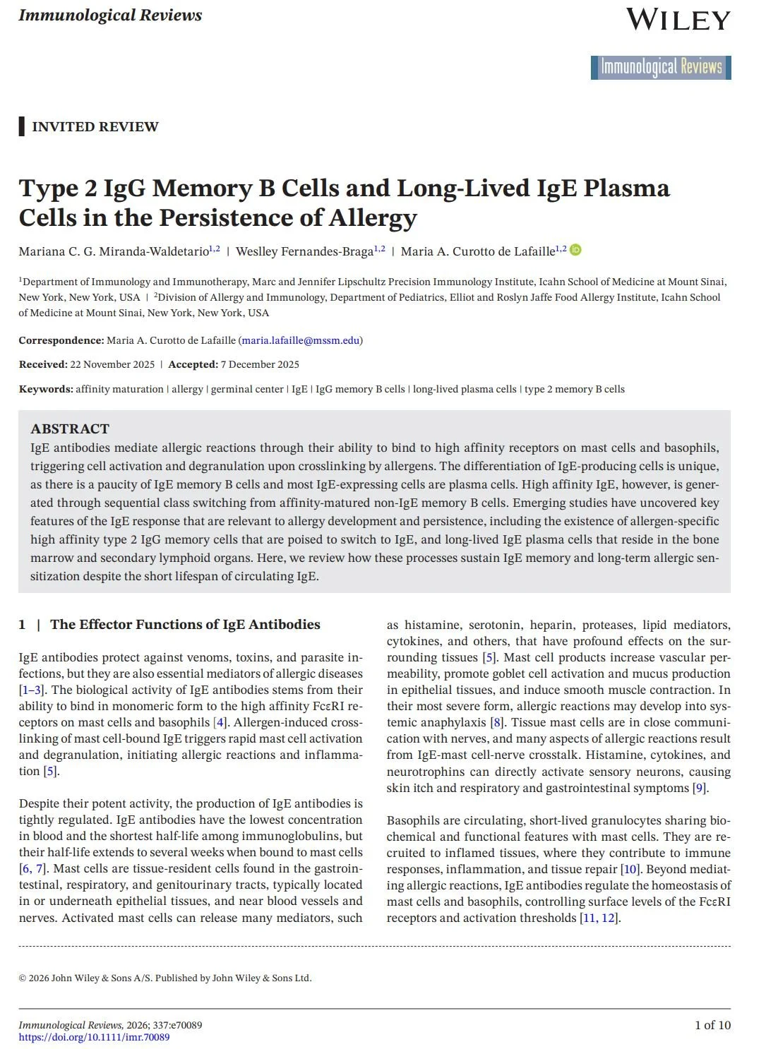 Journal articles Immunity. 2025 Nov 11;58(11):2717-2733.e7.doi: 10.1016/j.immuni.2025.10.011. Sci Transl Med. 2024 Feb 7;16(733):eadi0673.doi: 10.1126/scitranslmed.adi0673. Allergy. 2023 Mar;78(3):752-766.doi: 10.1111/all.15601. Nature Communications, 2017 Sep. 8: 641DOI: 10.1038/s41467-017-00723-0 Scientific Reports, 2016 Oct. Vol. 6 30784DOI: 10.1038/srep30784 J Exp Med. 2013 Nov 18;210(12):2755-71.doi: 10.1084/jem.20131539.Epub 2013 Nov 11. J Exp Med. 2012 Feb 13;209(2):353-64.doi: 10.1084/jem.20111941. J Clin Invest. 2005 Jul;115(7):1923-33.doi: 10.1172/JCI24487. Immunity 29, 114–126, July 18, 2008doi.org/10.1016/j.immuni.2008.05.010 Immunity. 2007 Feb;26(2):191-203.doi: 10.1016/j.immuni.2006.12.006.Epub 2007 Feb 8. Review Articles Immunological Reviews, 2026; 337:e70089https://doi.org/10.1111/imr.70089 Cells 2025, 14, 900https://doi.org/10.3390/cells14120900 Immunological Reviews, 2026; 337:e70078https://doi.org/10.1111/imr.70078 Front Immunol. 2019 Apr 26;10:715. doi:10.3389/fimmu.2019.00715 Current Opinion in Immunology 2024, 91:102488https://doi.org/10.1016/j.coi.2024.102488 Books and Chapters B cell memory of IgE responses in food allergy. (Contact mariana.waldetario@mssm.edu to obtain the PDF download) 2015th Edition(Contact maria.lafaille@mssm.edu to obtain the PDF download) Springer International Publishing Switzerland 2015DOI 10.1007/978-3-319-13725-4_1 Publications