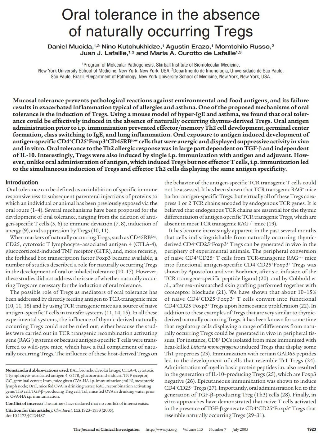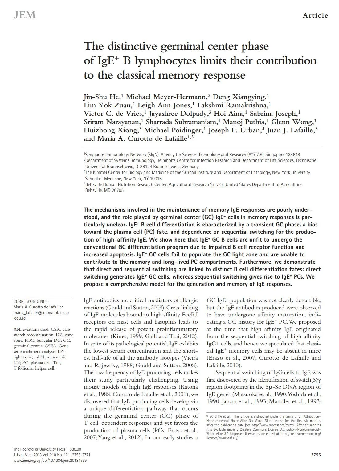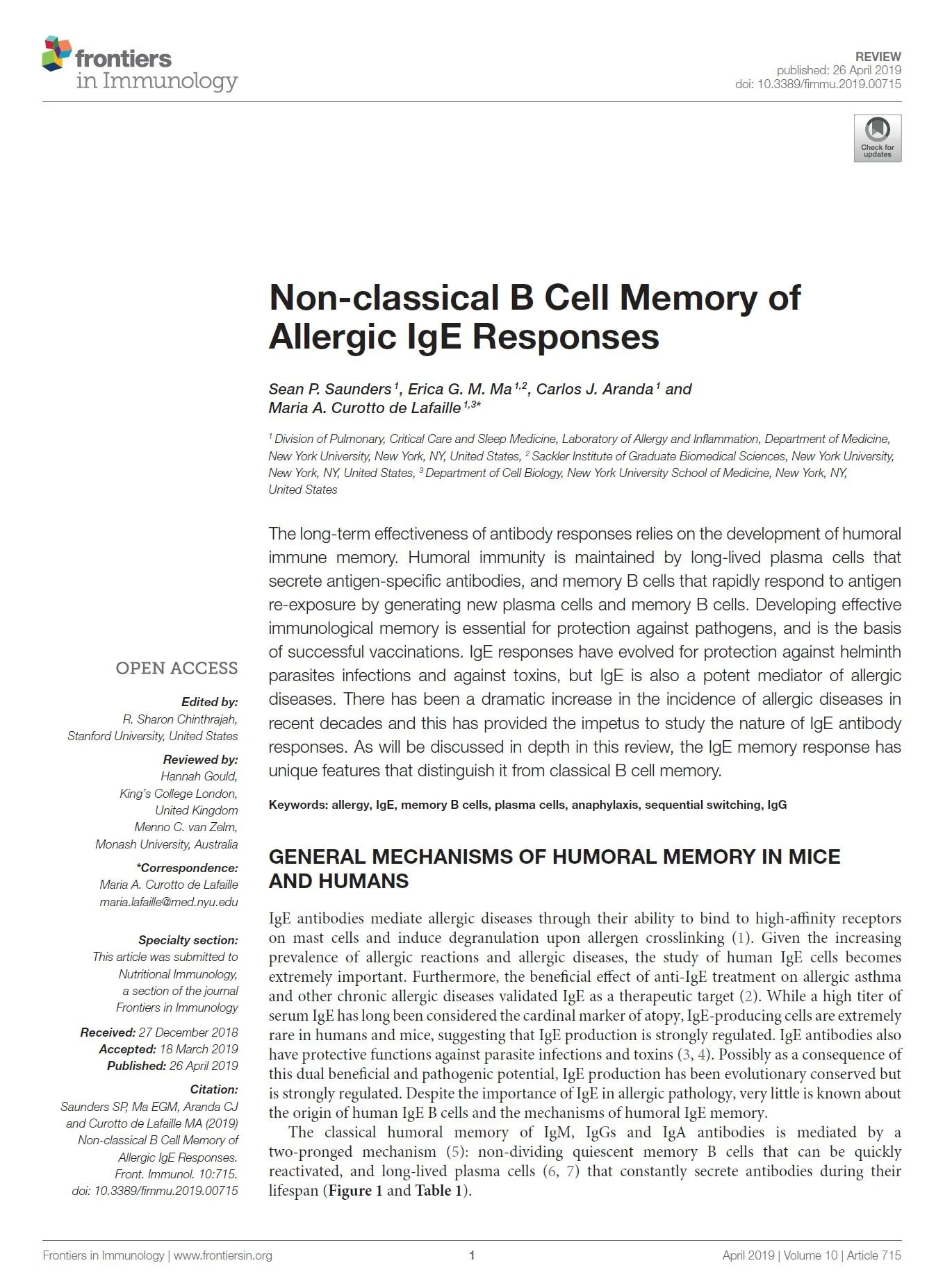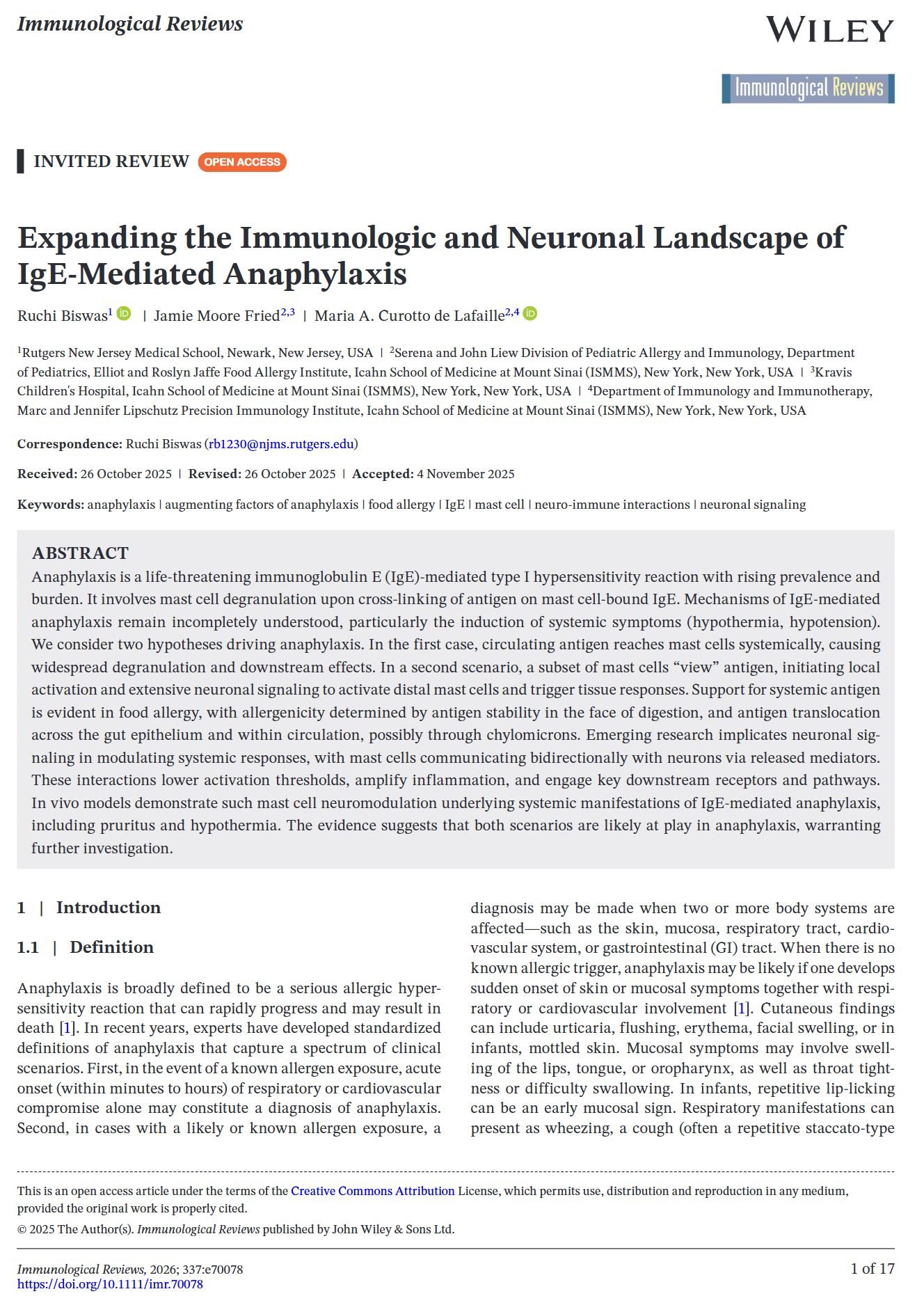 Journal articles Immunity. 2025 Nov 11;58(11):2717-2733.e7.doi: 10.1016/j.immuni.2025.10.011. Sci Transl Med. 2024 Feb 7;16(733):eadi0673.doi: 10.1126/scitranslmed.adi0673. Allergy. 2023 Mar;78(3):752-766.doi: 10.1111/all.15601. Nature Communications, 2017 Sep. 8: 641DOI: 10.1038/s41467-017-00723-0 Scientific Reports, 2016 Oct. Vol. 6 30784DOI: 10.1038/srep30784 J Exp Med. 2013 Nov 18;210(12):2755-71.doi: 10.1084/jem.20131539.Epub 2013 Nov 11. J Exp Med. 2012 Feb 13;209(2):353-64.doi: 10.1084/jem.20111941. J Clin Invest. 2005 Jul;115(7):1923-33.doi: 10.1172/JCI24487. Immunity 29, 114–126, July 18, 2008doi.org/10.1016/j.immuni.2008.05.010 Immunity. 2007 Feb;26(2):191-203.doi: 10.1016/j.immuni.2006.12.006.Epub 2007 Feb 8. Review Articles Immunological Reviews, 2026; 337:e70089https://doi.org/10.1111/imr.70089 Cells 2025, 14, 900https://doi.org/10.3390/cells14120900 Immunological Reviews, 2026; 337:e70078https://doi.org/10.1111/imr.70078 Front Immunol. 2019 Apr 26;10:715. doi:10.3389/fimmu.2019.00715 Current Opinion in Immunology 2024, 91:102488https://doi.org/10.1016/j.coi.2024.102488 Books and Chapters B cell memory of IgE responses in food allergy. (Contact mariana.waldetario@mssm.edu to obtain the PDF download) 2015th Edition(Contact maria.lafaille@mssm.edu to obtain the PDF download) Springer International Publishing Switzerland 2015DOI 10.1007/978-3-319-13725-4_1 Publications